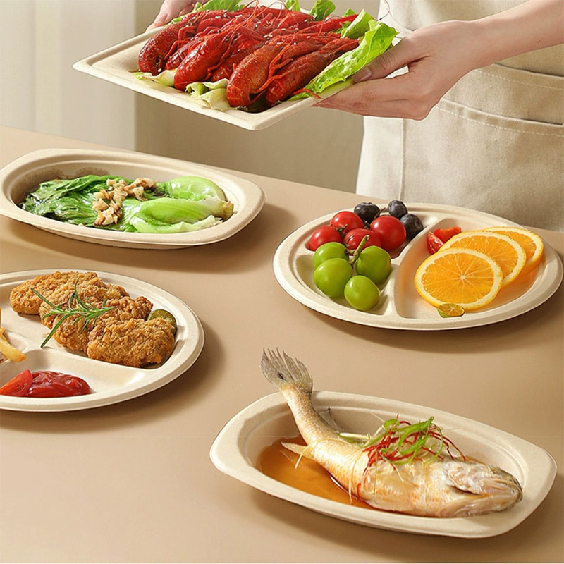 7" * 9"Material y sostenibilidad:Fabricados a partir de pulpa de bagazo de caña de azúcar (un subproducto agrícola renovable), estos platos son 100% biodegradables y compostables en instalaciones industriales, lo que reduce los residuos en los vertederos.
