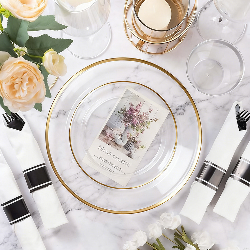 ✨Plato llano de plástico transparente con borde dorado:Elegante plato desechable con detalles metálicos de primera calidad.