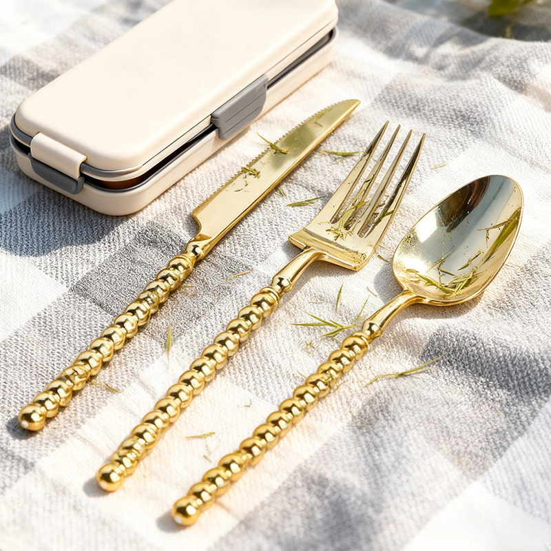 GoldProduct Configuration: Complete disposable cutlery set including knife, fork, and spoon, made of high-quality PS (polystyrene) material. Food-safe and compliant with international food contact standards.