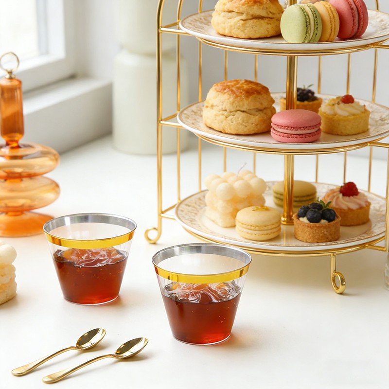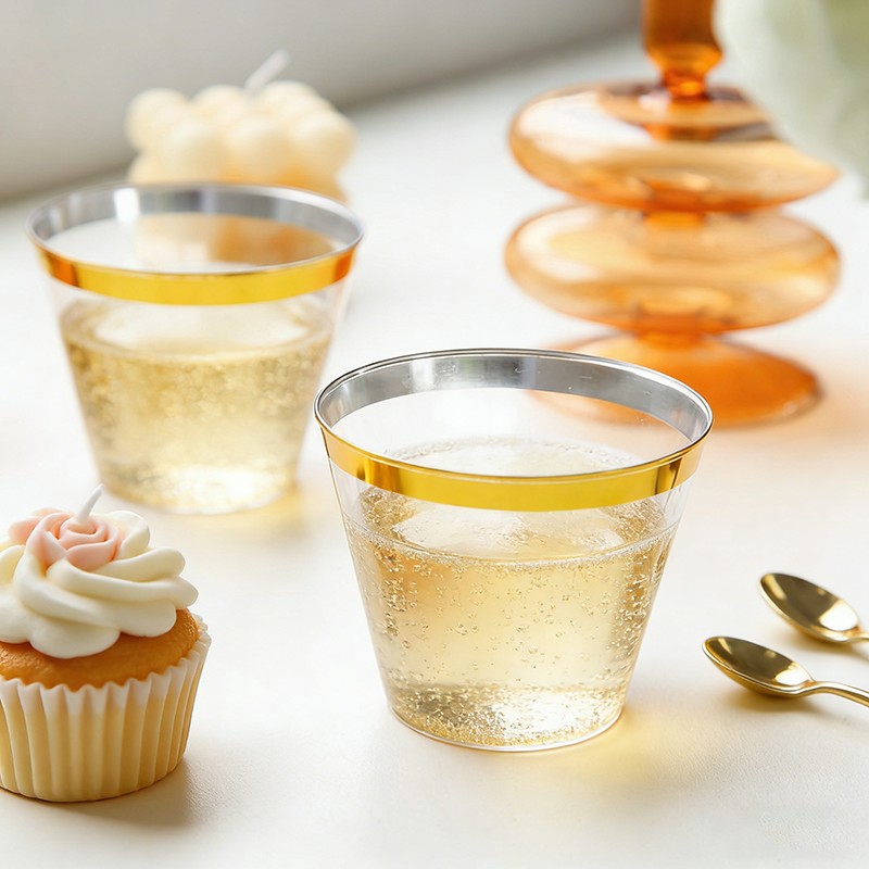 Elegante diseño con borde doradoCuerpo transparente con borde dorado brillante, apariencia elegante y exclusiva para realzar la configuración de las mesas para bodas, fiestas y eventos formales.