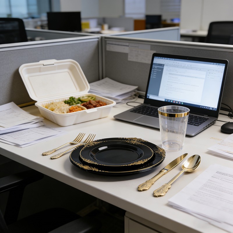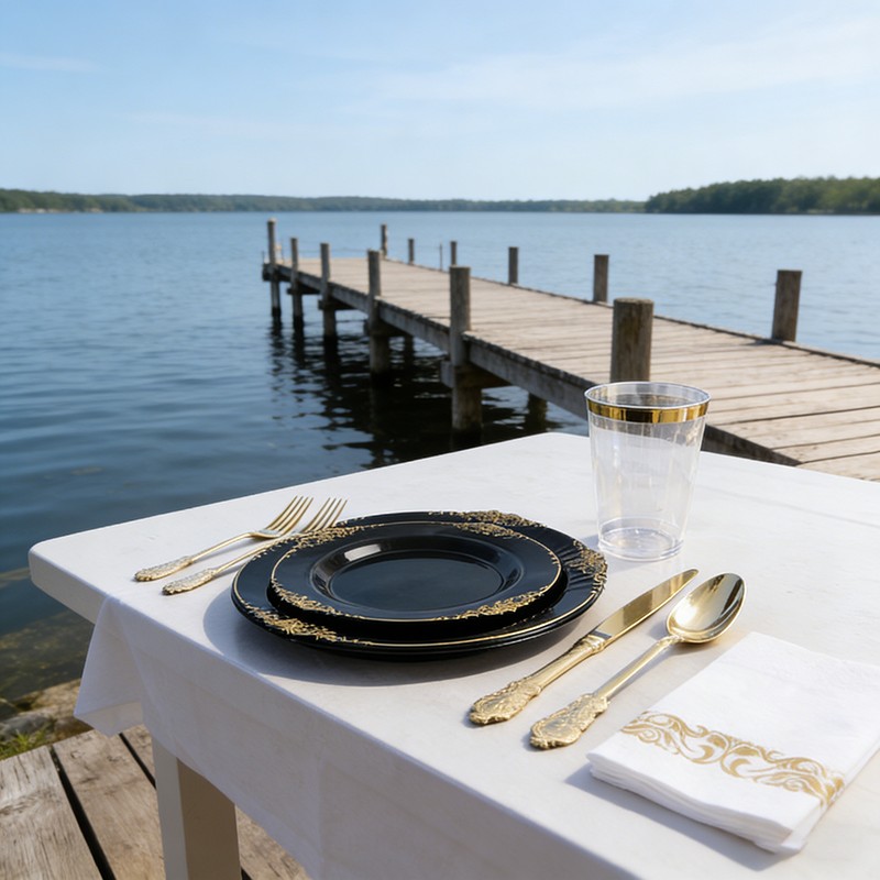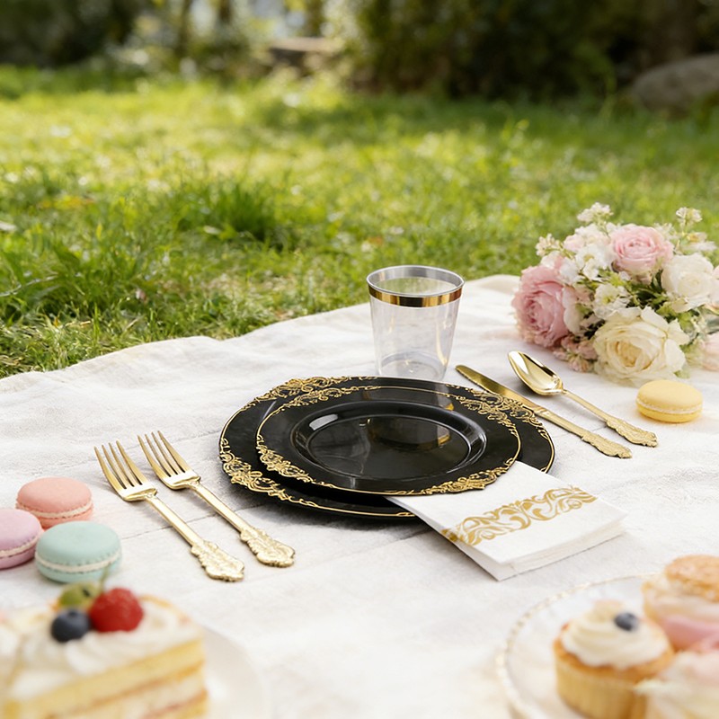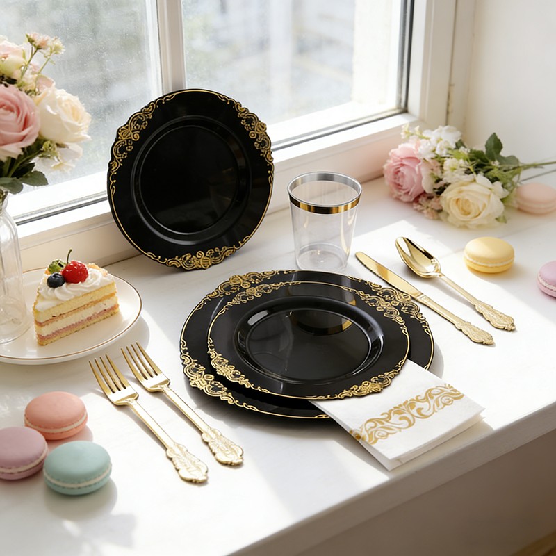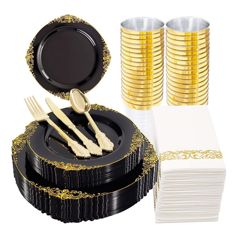 500 setsLuxury Black & Gold Design: Sophisticated black base with shiny gold rim, modern and upscale, perfect for luxury weddings, formal parties and high-end events.
