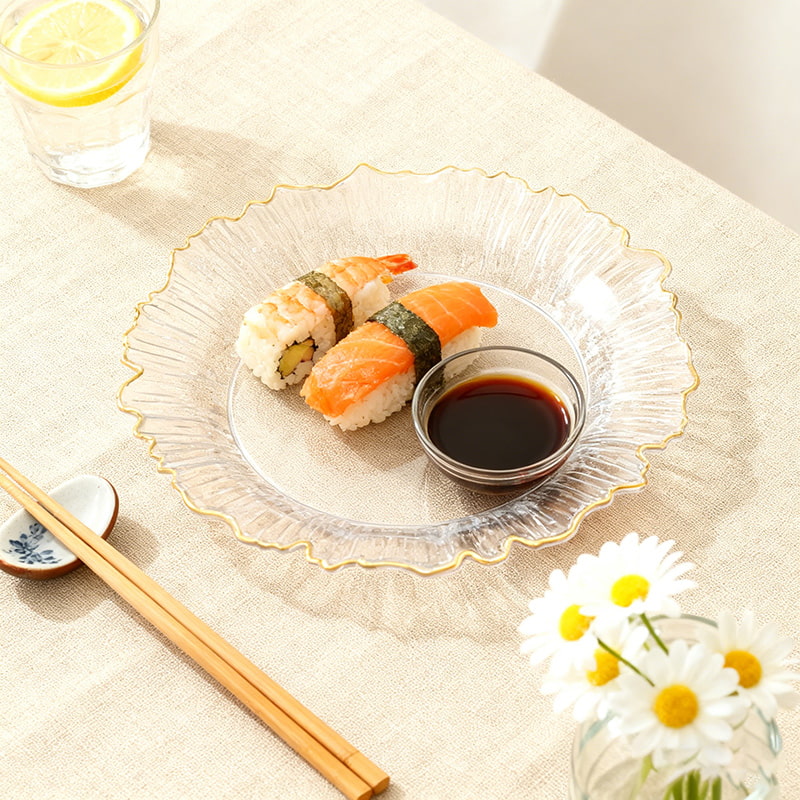 Diseño artístico y elegante:Silueta irregular única de forma libre para una apariencia moderna y artística; el cuerpo cristalino muestra los colores y las texturas de los alimentos, combinado con un delicado borde dorado que agrega un acabado refinado y lujoso a las mesas.