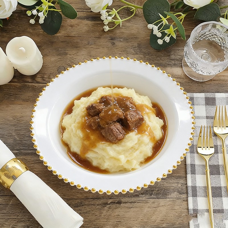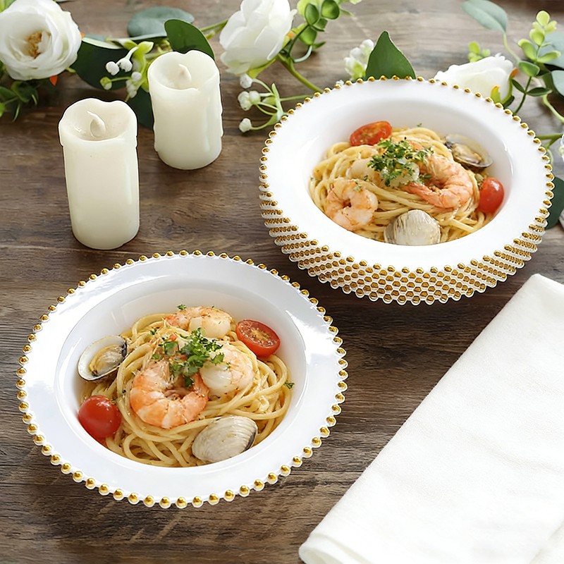 The handcrafted gold pearl beaded edge elevates the classic white bowl, turning casual picnics and formal weddings into elegant affairs.